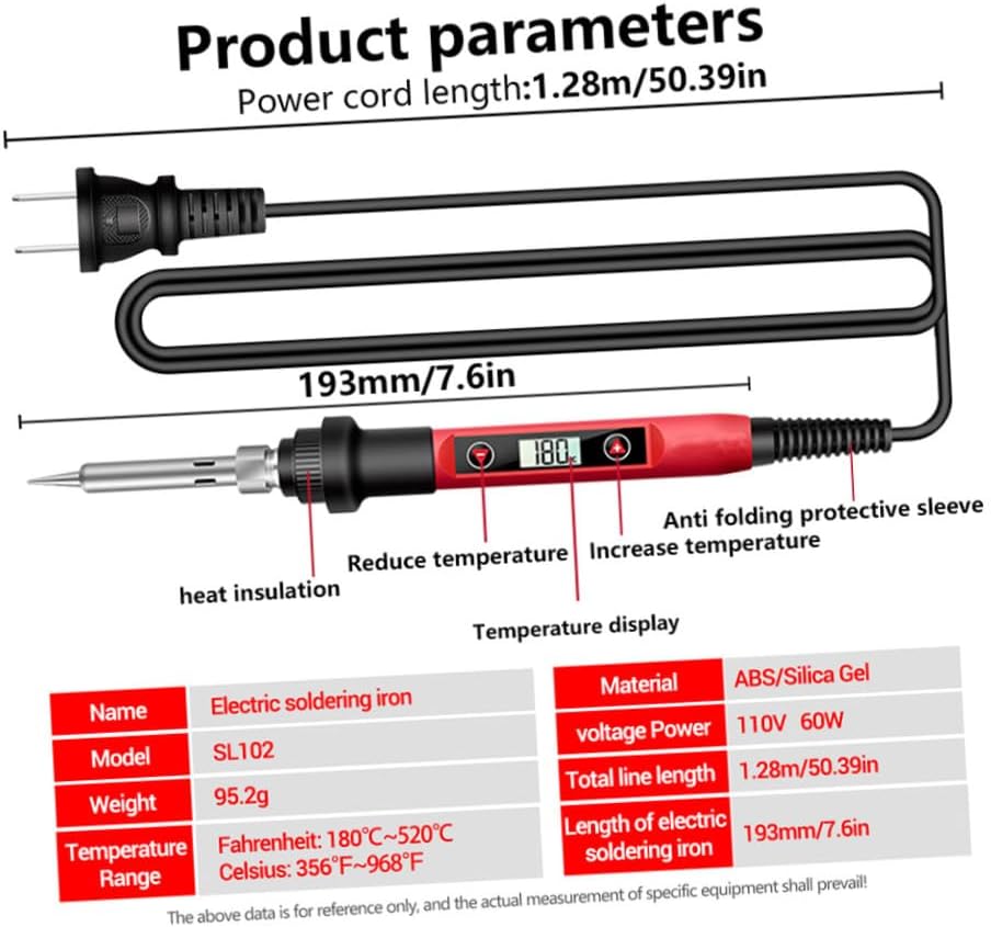 • Solder--the soldering iron has buttons that can adjust the temperature, which brings great convenience to your use,adjustable soldering iron