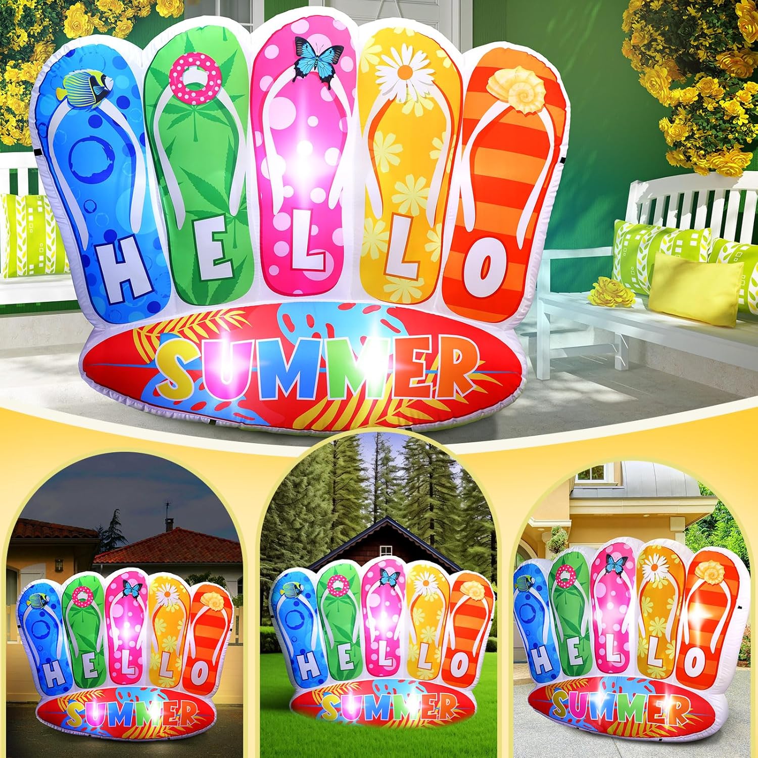 Features: When inflated, this inflatable flip flops serves as the nice photo background, enticing people's attention and assuring a memorable photographical experience. Stand out and make a statement with your pictures! Want a novel gift idea? Why not this bright colored, summer blow up yard decoration? It's not just a decoration, it's a token of the joy and beauty of summer time, making it an ideal gift for friends and family. Specifications: Material: 210T polyester Color: bright color Size: about 4.92 x 6.37 ft/ 1500 x 1943 mm Package includes: 1 x Inflatable flip flop with surfboard decoration Notes: Manual measurement, please allow slight errors on size. The color may exist a slight difference due to different screen displays. Do not overinflate to avoid bursting.