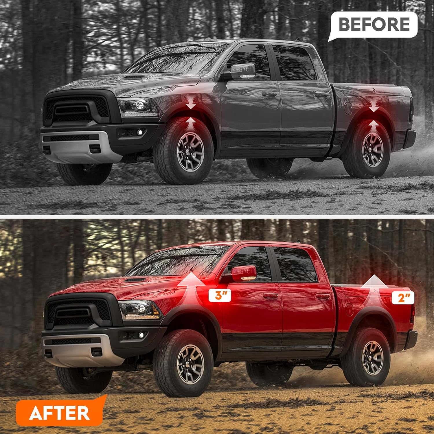 Fitment: Compatible with 2007-2020 Chevy Silverado 1500 Compatible with 2007-2020 GMC Sierra 1500 NOTES: Note: Raise the truck by 3 inches at the front and 2 inches at the rear, the ratio between lift height and kit thickness is not 1:1 Function: Raise the front and rear height of the vehicle to achieve a more aggressive appearance, and prevent chassis rubbing when installing larger tires.