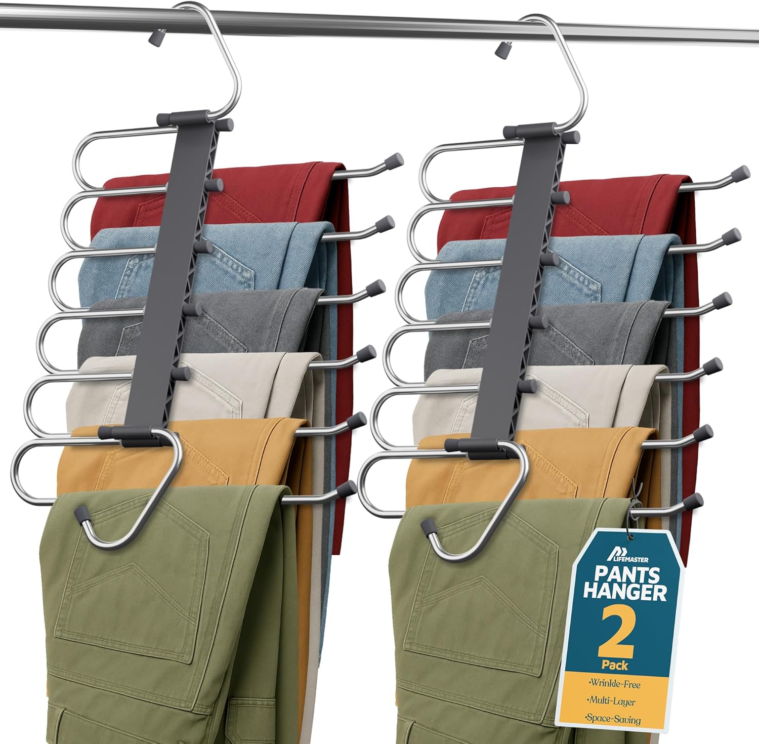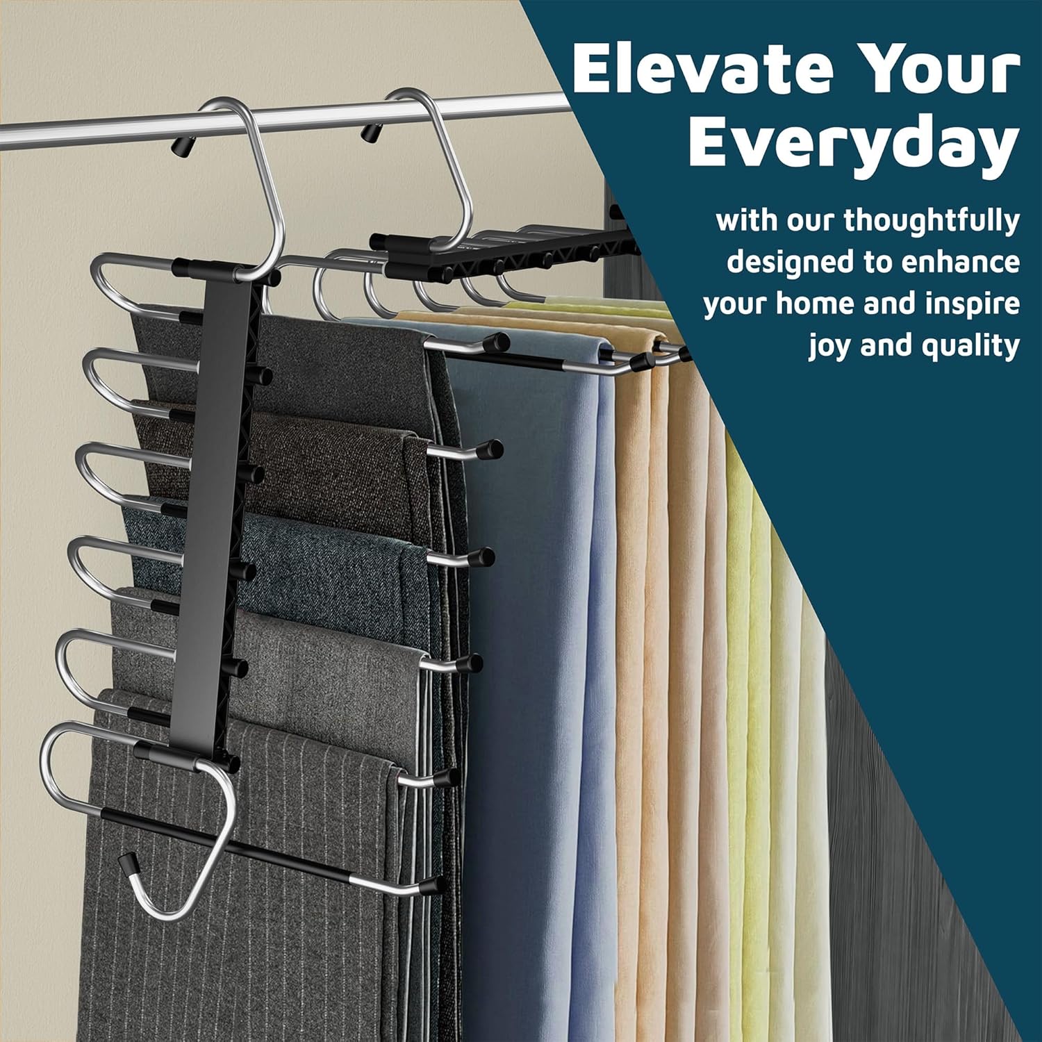 Transform your closet chaos into streamlined serenity with the Campior Multiple Shirt Hanger. Designed with a smart 6-layer structure, each multiple hangers in one allows you to store up to six pairs of jeans, scarves, trousers, or skirts—all in one sleek organizer. Crafted with durable stainless steel rods and reinforced ABS plastic, this pants hanger offers a sturdy yet lightweight solution, holding up to 4.4 pounds per rod without losing shape. Whether you're conquering tight dorm closets or curating a dreamy walk-in wardrobe, Campior’s jean hangers space saving helps you reclaim valuable space—up to 80% more—while keeping everything neat, visible, and ready to wear. Flexibility is built into the design: use the multiple skirt hangers space saving vertically to maximize space or horizontally for easy access to everyday essentials. Plus, the thoughtful open-ended design makes it simple to slide items on and off, ideal for busy mornings and last-minute outfit changes. Each bar is coated with a non-slip layer and finished with a stopper at the end, ensuring your clothes stay secure and wrinkle-free, right where you left them. Best of all, it arrives ready to use—no tools, no assembly, no stress. Just a smarter, cleaner, more beautiful closet waiting for you. Choose Campior and experience the joy of stylish, space-saving organization—because every closet deserves a little more breathing room.