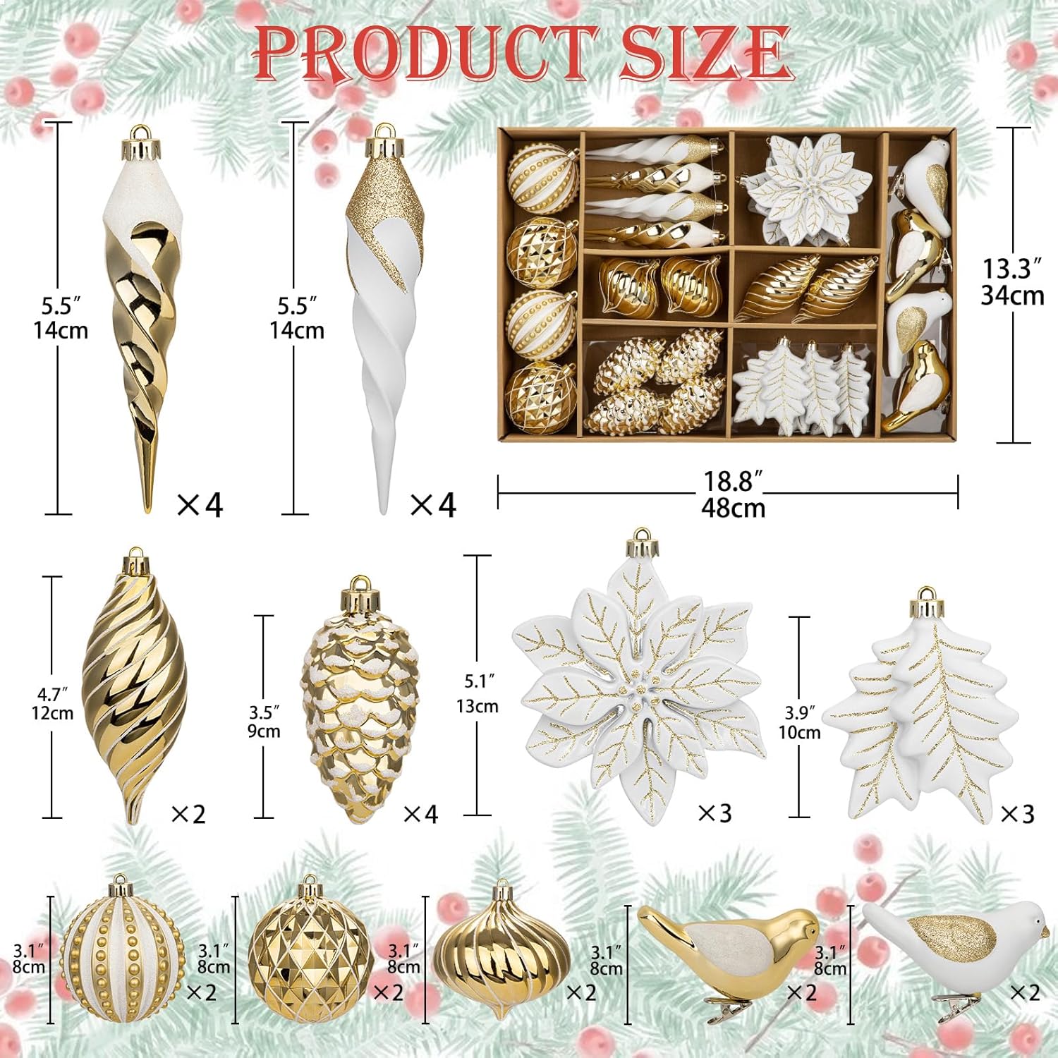 Elevate your holiday decor with our exquisite set of 30 Christmas balls, thoughtfully curated to bring a vibrant and enchanting touch to your festive celebrations. This collection features an array of stunning designs, including charming bird shapes, delicate flowers, whimsical painted patterns, shimmering icicles, and elegant golden pinecones. Crafted with attention to detail, each ornament is made from high-quality materials, ensuring durability and a lasting shine throughout the season. With a perfect balance of colors and textures, these ornaments will effortlessly complement any holiday theme, whether traditional, modern, or eclectic. Use them to adorn your Christmas tree, create stunning garlands, or embellish your holiday wreaths. Each ornament is lightweight and easy to hang, making decorating a breeze. Bring the joy of the season into your home with our diverse and delightful Christmas ball set! Package: 30 piece of Christmas Balls Material: PVC Ball Size: approx. from 2.36" Perfect home decoration for Christmas parties, easily hung from tree branches or used for garlands, decorations, and more.