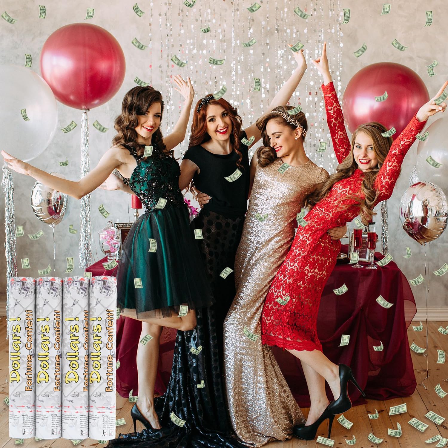 【Special Celebration】 Twist the switch of the dollar confetti cannon and let the mini simulated banknotes spray out. The fluttering simulated dollars will make your party more shocking. 【Safe and Environmentally Friendly】 Uses air to drive the confetti jet inside the dollar cannon. Does not contain gunpowder. The party poppers all made of biodegradable and environmentally friendly materials. 【Excessive Amount of Confetti】 To make your party more exciting, our dollar party poppers come with 500pcs of mini simulated dollars inside. The weight of the single cannon is about 9.5 oz (270g). 【Enhanced Confetti Cannon Drive】 Use the enlarged party cannon drive (10cm air tank) to make the confetti spray higher. Of course, you don't need to worry about it having safety hazards, because there is a safety net inside, it will only spray confetti out, whether indoors or outdoors, so your party is held safely. 【GET RICH】 Whether it's a company opening, a signing ceremony, a promotion party, a nightclub bash, or a New Year's Eve, birthday, or holiday party, you can use our dollar confetti to add to the party atmosphere.
