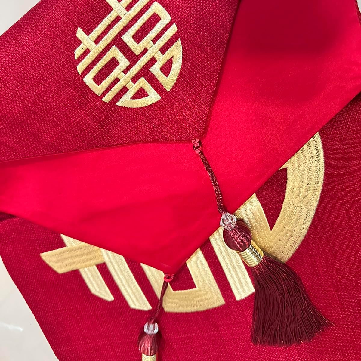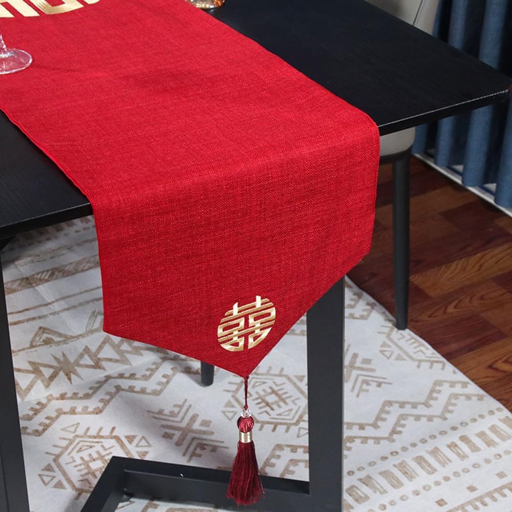 • Classic Chinese Elegance: This table runner featuring the gold "Double Happiness" embroidery, a symbol of joy and marital bliss in Chinese culture. Its rich red color and detailed design add a touch of traditional elegance to any wedding or festive occasion