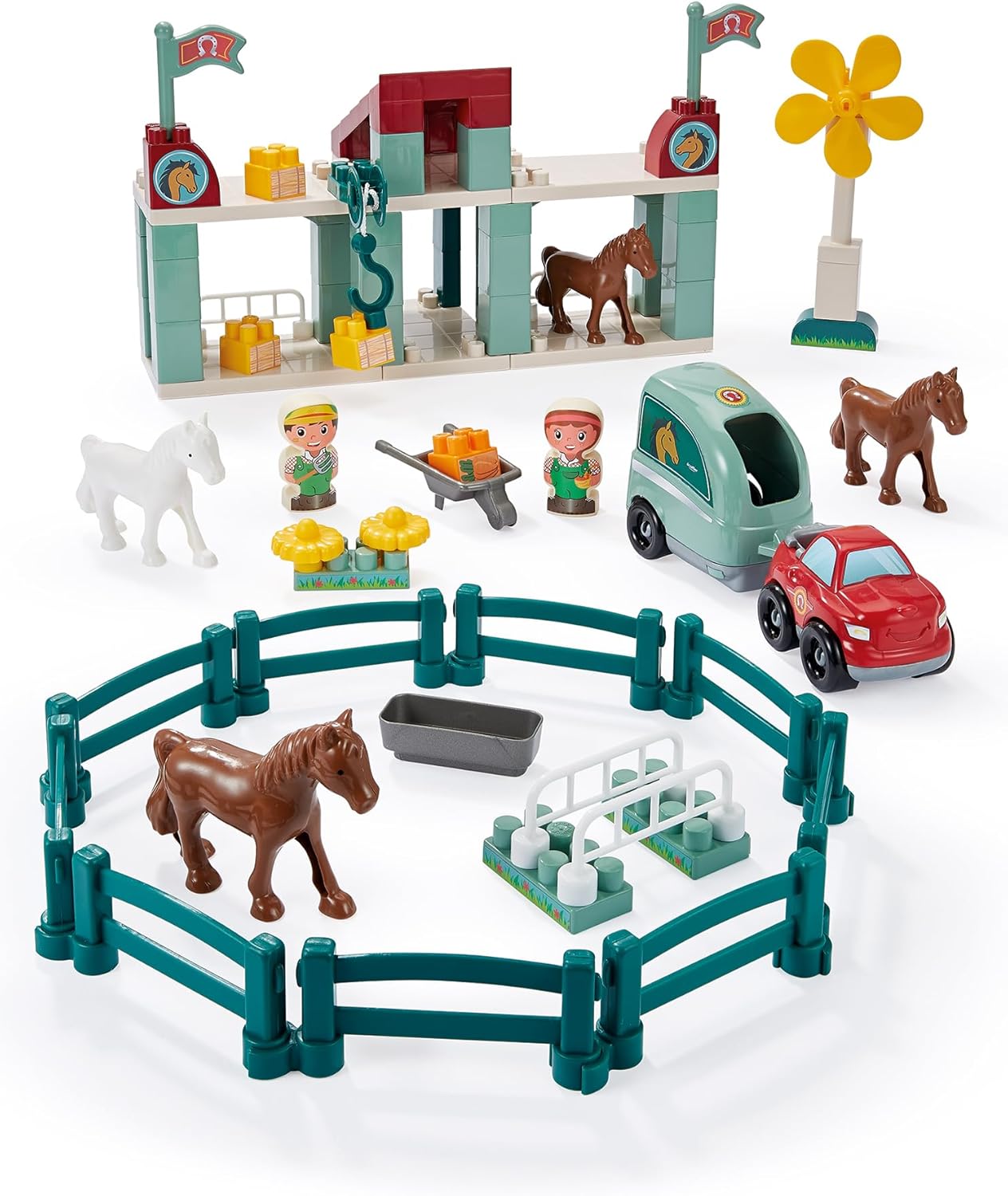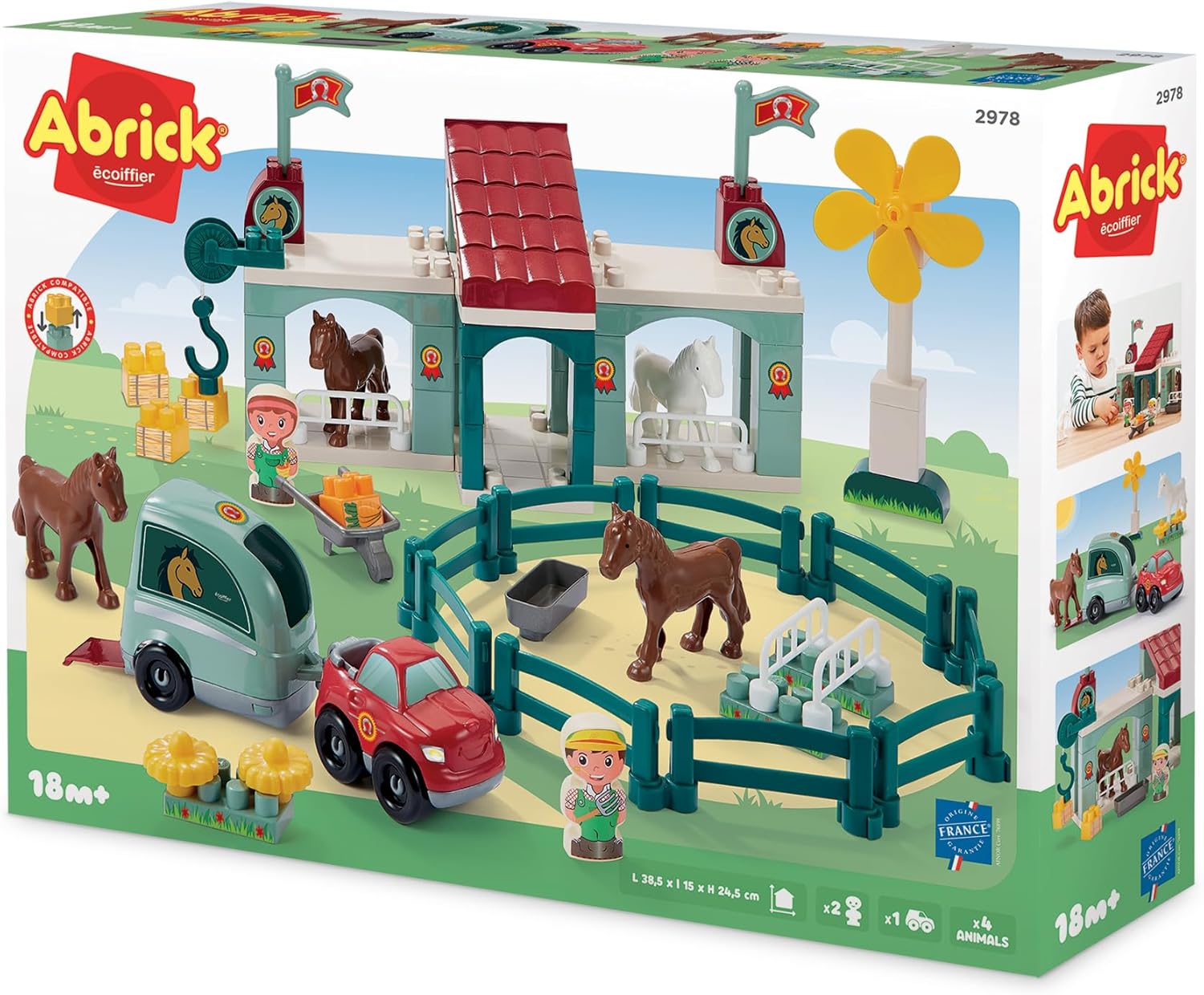 Horse stable for building with horses, 1 carousel, 1 pickup with its transporter, 1 windmill, 2 peronians and lots of accessories such as a riding yard. From 18 months. Made in France.