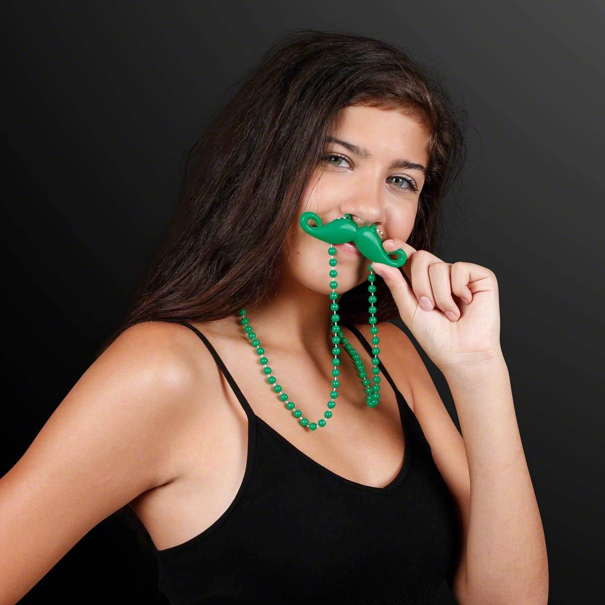 Green Mustache Necklace on Green Beads were cool before you knew they existed. Trendy peeps will revel at the chance to drape these Mardi Gras Beads around their necks, plus hold the cute moustache charm up to your face for laughs all night! Hipster Mustache Bead Necklaces are great to share at festivals and concerts + give them out as party favors - affordable fun. NOTE: No lights in this product! It's an old-school classic Mardi Gras style necklace. Bead Color: Green. Mustache Pendant Color: Green. Necklace Length: 32" Hipster Mustache Pendant (WxH): 4" x 1. 25"