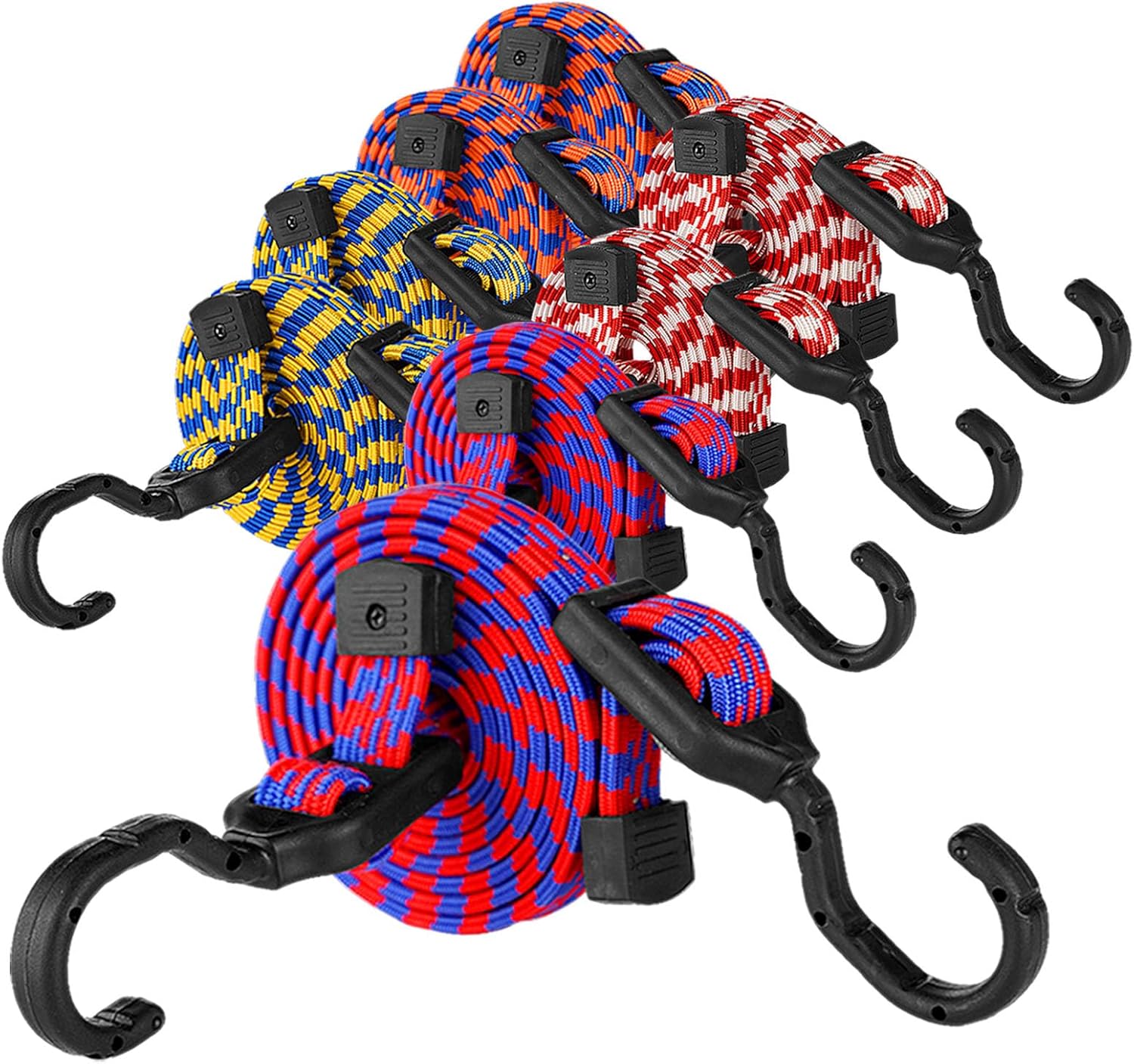Built for strength, stability, and versatility, these 40-inch flat adjustable bungee cords with hooks are engineered for secure cargo transport and demanding outdoor use. Designed to handle a wide range of tie-down needs, they offer dependable performance for everyday hauling, storage, and outdoor activities. The dual-end adjustable design allows tension to be adjusted from either side, making it easier to secure loads of different shapes and sizes without detaching the hooks. This flexible adjustment method helps save time during setup while ensuring a precise, controlled fit for both short and long tie-down applications. For added safety and confidence, these bungee cords feature a heavy-duty quad-lock (4-latch) multi-step locking system. The locking process grips the strap through multiple contact points, helping resist rope slippage and maintain consistent tension. Each locking point functions independently, allowing the system to lock tighter under load, providing a more secure hold when cargo shifts during transport. Integrated injection-molded steel hooks enhance load strength and durability, while reinforced tail clips help prevent strap pull-through, delivering reliable, multi-layer protection during use. Unlike traditional round bungee cords, the flat strap construction is designed to stay flat under tension. By offering wider surface contact, the strap resists rolling and twisting, distributes pressure more evenly, and helps reduce marks or dents on your cargo. This design provides a more stable hold and improved load control compared to standard round elastic cords, especially on flat or rigid surfaces. Constructed with UV-resistant polyester webbing and a premium rubber core, these heavy-duty outdoor bungee straps deliver dependable elasticity with approximately 1.8–2× stretch. The controlled stretch provides firm, sag-free tension that helps keep cargo secure without excessive rebound or slack. This 4-pack of 40-inch flat adjustable bungee cords is ideal for medium-duty tie-down tasks. The 40-inch length offers a practical balance between reach and control, making it well suited for securing boxes, tool cases, coolers, camping gear, and equipment during everyday transport or outdoor use. Suitable for home, travel, and outdoor applications, these rubber bungee straps with hooks are commonly used for organizing household items, securing loads in cars, trucks, SUVs, and trailers, or tying down gear for camping, biking, and other outdoor activities. Durable, dependable, and easy to use, they provide peace of mind wherever reliable tie-down strength and stability are required.