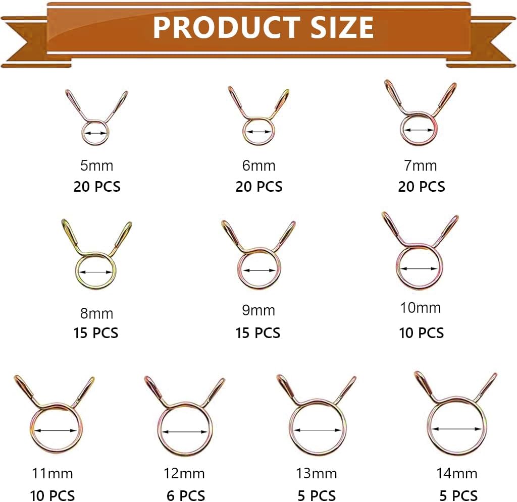 126Pcs Wire Hose Clamps ,Multi Sized Metal Spring Clips for Tubing, Fuel Lines & Water Pipes, Stainless Steel Wire Clips for Motorcycle, Automotive & Plumbing Use