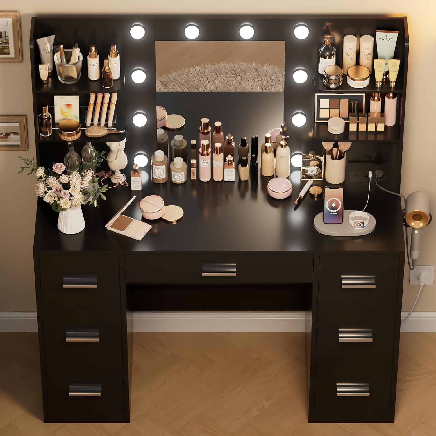 | Item Type Name | with Mirror and 10 Lights, Table with 7 Drawers and 4 Open Shelves, 3 Color Modes and Adjustable Brightness, Charging Station for Bedroom |