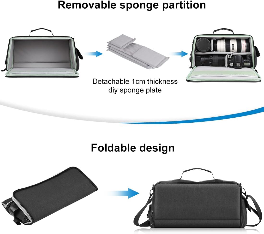 1. Made of waterproof fabric material, waterproof and wear-resistant2. Large-capacity hierarchical storage design to meet daily needs3. Thicken the fabric in the middle to reduce the damage to the camera caused by vibration4. Light weight and foldable, includes padded compartments and dividers inside.5. It has dual zippers to protect your equipment from being damaged.6. Adjustable and lengthening shoulder straps, soft and comfortable.7. With multiple pockets inside, cellphone, cable, and other small items can be stored