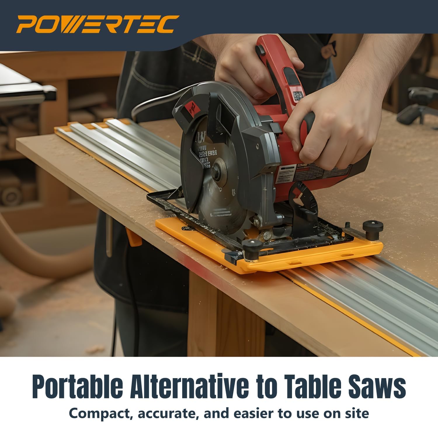 POWERTEC 72094 53 Inch Circular Saw Track Joining Set – 2x26.5" Dual-Edged Guides with ConnectorTransform Your Circular Saw into a Track SawNo need for costly dedicated track saws—this joining set turns your standard circular saw into a high-precision cutting system. Get straight, accurate, and repeatable cuts every time, whether you’re working in your workshop or on the jobsite.53" Cutting Capacity, Modular DesignIncludes two 26.5" guide rails that connect seamlessly into a full 53-inch cutting track—ideal for sheet goods, plywood, and long rip cuts. The two-piece modular setup is easier to carry, store, and transport than one long track, making it the perfect portable solution for professionals and DIYers alike.Universal CompatibilityDesigned with adjustable base plate clamps, dual mounting positions, and an indexing stop, this system works with both left- and right-bladed saws. Built to adapt, it ensures your saw stays locked in alignment for straight and accurate results.Cleaner, More Controlled CutsEquipped with six vibration-reducing silicone pads, the guide stays stable even on slick work surfaces. These pads absorb motor vibration, minimize sliding resistance, and deliver smoother operation for precise, controlled cuts.Splinter-Free ResultsFeatures a splinter guard strip that calibrates directly to your saw’s cut line. This eliminates tear-out and ensures clean, professional-quality edges—perfect for cabinetry, furniture building, and fine woodworking projects.Built for Contractors, Remodelers & DIYersSkip the hassle of hauling a heavy table saw. Compact, portable, and job-site ready, this system delivers the performance you need in tight spaces, apartments, and mobile workshops. Cut sheet goods, panels, and plywood with confidence and efficiency.