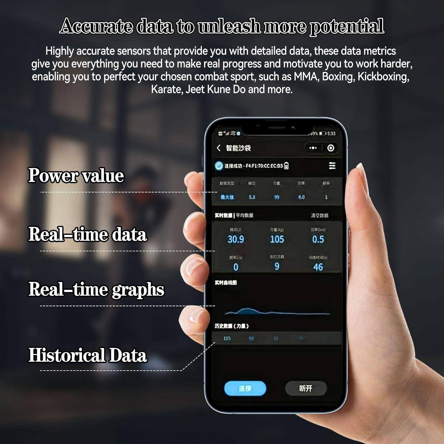 • Enhance your training experience with our Data Visualization & Sharing tool. Connect your smartphone to a TV or projector to display real-time data on a large screen. Perfect for group sessions, fitness classes, or personal training, it helps you monitor every punch and kick, keeping you motivated and focused on achieving your fitness goals.