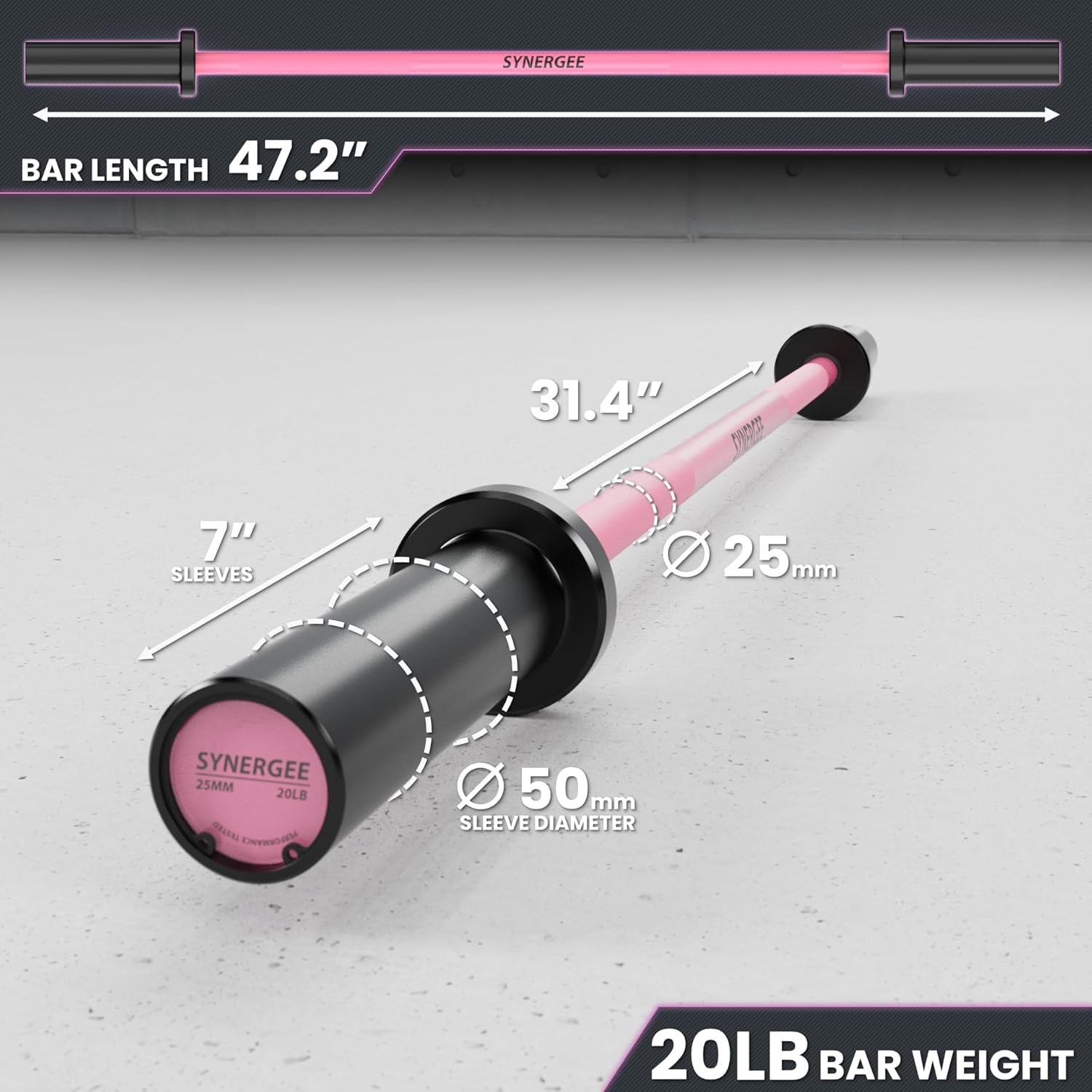 The Synergee Olympic Barbell (available in 4ft/20lb or 4.8ft/25lb) is designed for home gyms and serious strength training. With a 350lb capacity, this barbell provides a smooth spin for controlled lifts like squats, deadlifts, bench presses, curls, and overhead presses. Crafted with durable 41,600 PSI tensile strength and high-quality bushings and ball bearings, it ensures long-lasting performance. The 2-inch sleeves fit standard weight plates. Ideal for compact spaces, it combines power, precision, and space-saving design.