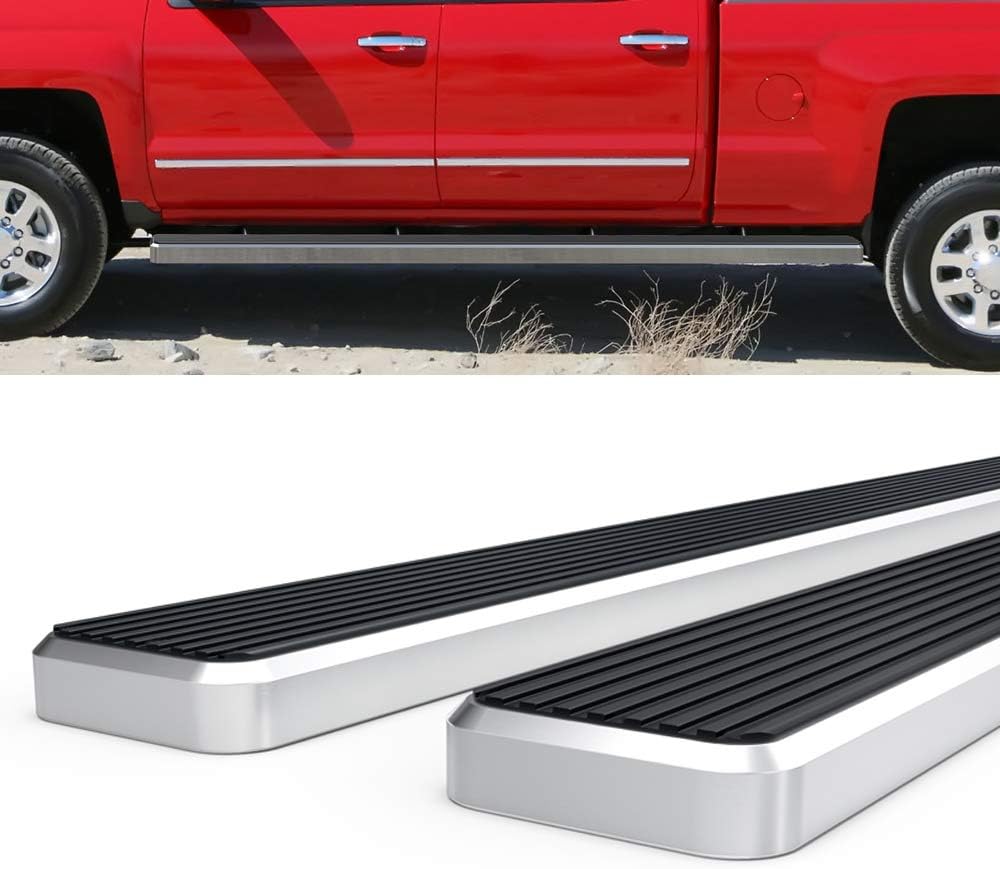 Fitments 2007-2018 Chevrolet Silverado GMC Sierra Crew Cab 6.5ft Bed(Incl. Diesel Models With DEF Tanks)IntroductionWheel to wheel running boards provide easy truck bed access to longer wheel-base pickup trucks. These running boards span front to rear wheel, whereas other side steps are just door to door length. eBoard running boards are custom fit and install bolt-on style to your truck's frame or rocker panel (applications vary). eBoards have a simple, low profile design that put bulky and over styled nerf bars to shame. The eBoard's aircraft grade aluminum body supports up to 500 lbs without flexing. With a full length, non-slip step pad, these running boards offer a safer and more comfortable step for passengers and drivers alike. Available in 4, 5, or 6 inches, and finishes in brushed aluminum or powder coated black, eBoard running boards are a top choice for your family!SpecificationMaterial: T6 Aircraft Grade AluminumFinish: Brushed AluminumStyle: wheel to wheel running boardsInstallation: Bolt on installation, no drilling requiredItem OfferedSet (2) of running boards + brackets + hardware