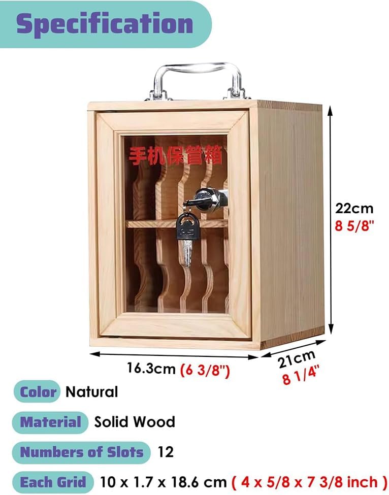 This phone storage box features numbered slots for easy identification, effectively keeping your devices organized.It's perfect for classrooms and conference rooms, as well as offices, phone repair shops, and other public spaces.Product SpecificationsMaterial: Solid wood (pine) + acrylicDimensions:12 Slots: 16.3*21*22cm36 Slots: 29.5*21*32.4cm48 Slots: 29.5*21*43cm60 Slots: 36*21*43cmCompartment Dimensions: 10*1.7*18.6cmMounting: Portable/Wall-mountWeight:12 Slots: 2.1kg36 Slots: 4.3kg48 Slots: 5.3kg60 Slots: 6.4kgContents: 1 Phone LockerKeys: 2