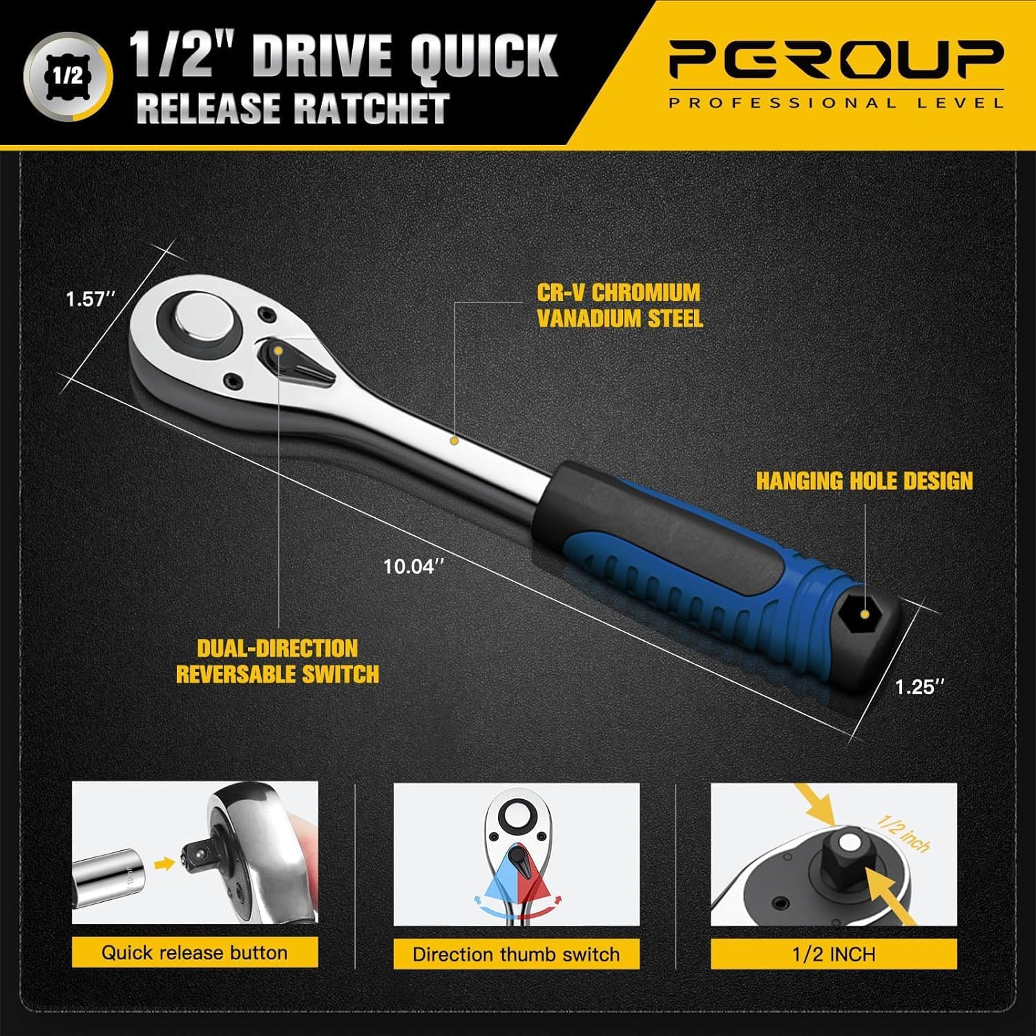 | Included Components | 1pc universal joint 1/2", 1pcs Extension bar 10", 1pcs ratchet handle 1/2"&1pc adapter 3/8"F x 1/2"M, 2pcs spark plug socket 16mm & 21mm, 8mm-32mm Metric socket set &8mm-19mm wrench |