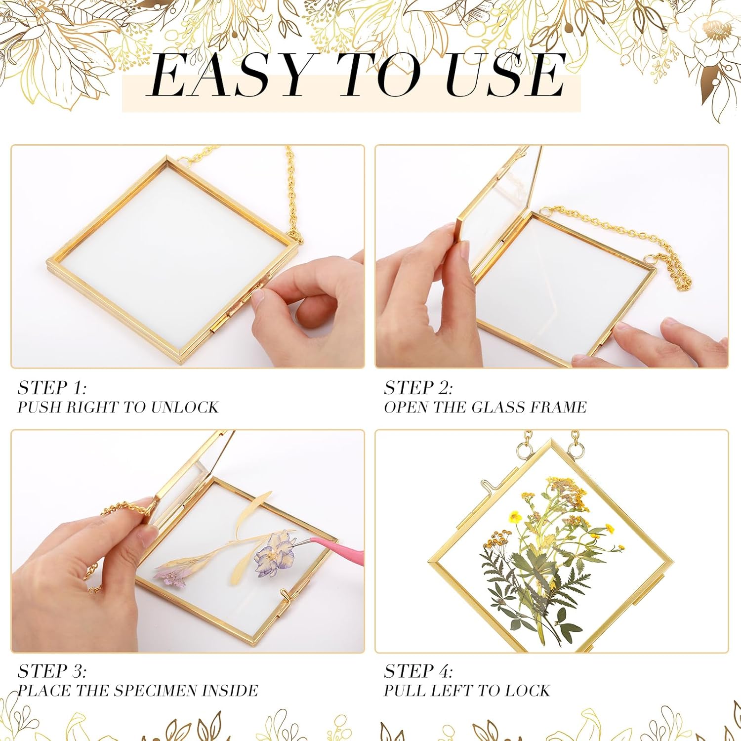 Features: This gold picture frame is a beautiful piece of decor. It adds a sophisticated appeal, making it an extraordinary present that is not only stylish but also practical. Despite its mini size, our vintage style metal square photo frame holds an array of impressions including pressed flowers and dried plants. You can also use it to display a photo collage or as a customized signature frame. The adaptability of this hanging picture frame makes it a good accessory for any wall decor, adding a different touch of sophistication to your space. Specifications: Material: glass, brassColor: goldSize: about 3 x 3 inches/ 7.6 x 7.6 cmPackage includes: 6 Pcs horizontal square frame 6 Pcs vertical square frame Notes: Not including dry flower. Manual measurement, please allow slight errors on size.