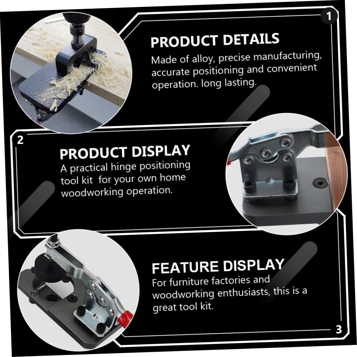 Package List 1 Set x Hinge Positioning Tools Characteristics - Size: 12.00X12.00X6.00 cm/ 4.72X4.72X2.36 inch - Color: As Shown - Material: Alloy - The hinge hole , lightweight and portable, easy to operateGoods DescriptionCrafted from durable alloy, this hinge hole opener set delivers precise hole positioning for cabinet hinges, transforming home woodworking tasks into accurate and efficient operations. From DIY carpentry to professional furniture assembly, the adjustable drill guide accommodates wood boards of different thicknesses, enabling versatile use across cabinetry projects. The lightweight and portable design enhances handling comfort, allowing users to focus on precise drilling without strain. Beyond functionality, this tool kit supports safer operation by minimizing slip risks and improving accuracy during hinge installation. Whether fitting cupboard doors or drawer guides, the set helps woodworking enthusiasts and professionals , consistent results. It fits seamlessly into home improvement routines, making hinge placement straightforward and boosting confidence in woodworking craftsmanship From WOONEKY was created to empower woodworking enthusiasts and professionals with tools that blend precision and ease of use. Our hinge positioning tools embody craftsmanship and innovation, enhancing every cabinet installation with reliable accuracy. By focusing on user-friendly design and durable materials, WOONEKY supports your pursuit of perfect woodworking projects. Experience the confidence that comes from tools designed to make every hole count—WOONEKY, precision in your hands