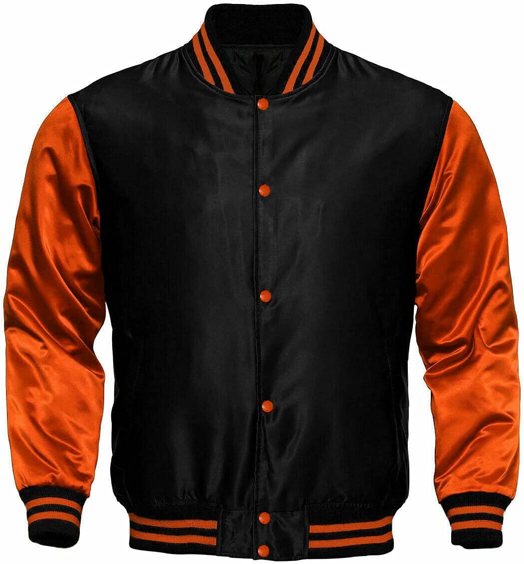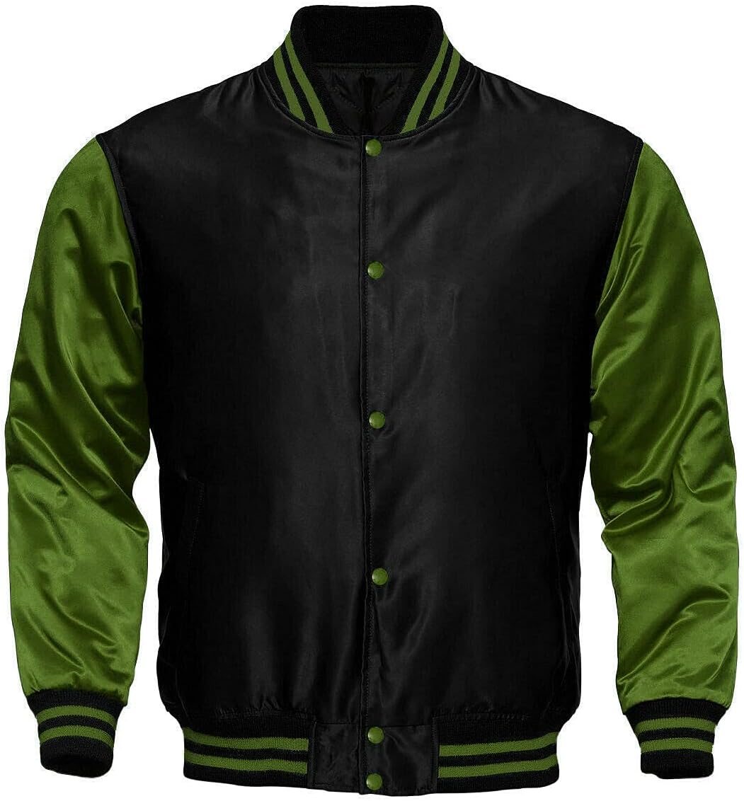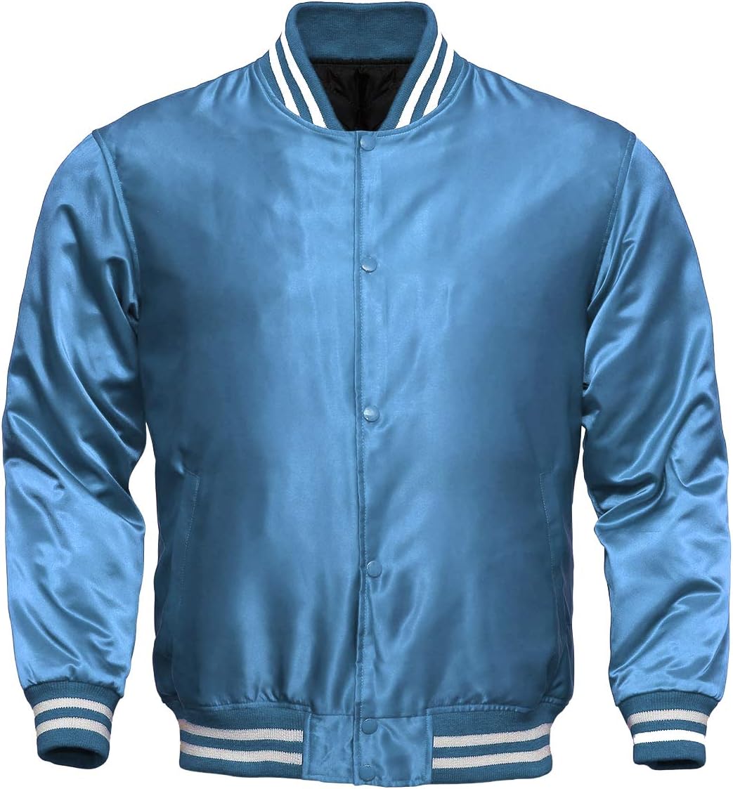 Sportswear Satin Solid Trim Rib Knit Collar Baseball Jacket Description: Outer shell of 100% Polyester satin Lined with 100% polyester brushed tricot Snap front 1x1 rib-knit collar cuffs and bottom band Regular sleeves Reinforced slash front pockets Water-resistant Machine-washable
