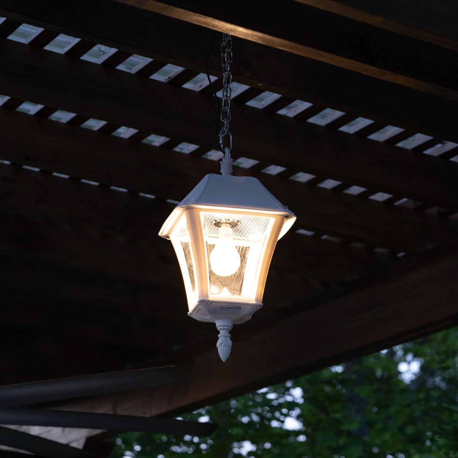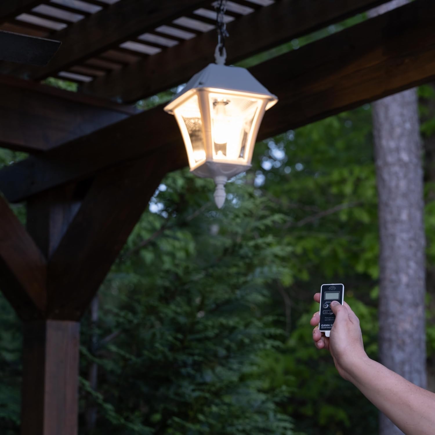 The Gama Sonic Baytown II Bulb 105BCX21 is a Solar Hanging Light that features a traditional design that resembles a 19th-century lantern. Installation takes minutes and comes with all necessary hardware needed for mounting this unit to any pergola, gazebo or overhang. Hanging 18-inches, the Baytown II Bulb Hanging Solar Light is constructed of weather-resistant rigid-resin with a white finish. This Solar Hanging Chandelier incorporates our cutting-edge GS solar LED light bulb technology and provides 360-degree illumination. At dusk, the Solar Hanging Lamp provides a brightness of 250 lumens in a warm white (2700K) color temperature. No wiring is needed. This Solar Outdoor Hanging Light is equipped with a new revolutionary capability, the included remote control, that allows you to operate the solar light from up to 10-feet away. Stylish and easy to install, this Solar Powered Hanging Light is the perfect solution for DIY enthusiasts looking to upgrade their exterior lighting, especially in hard to reach places. Just place the solar panel in a spot with ample direct sunshine and let the sun do the rest.