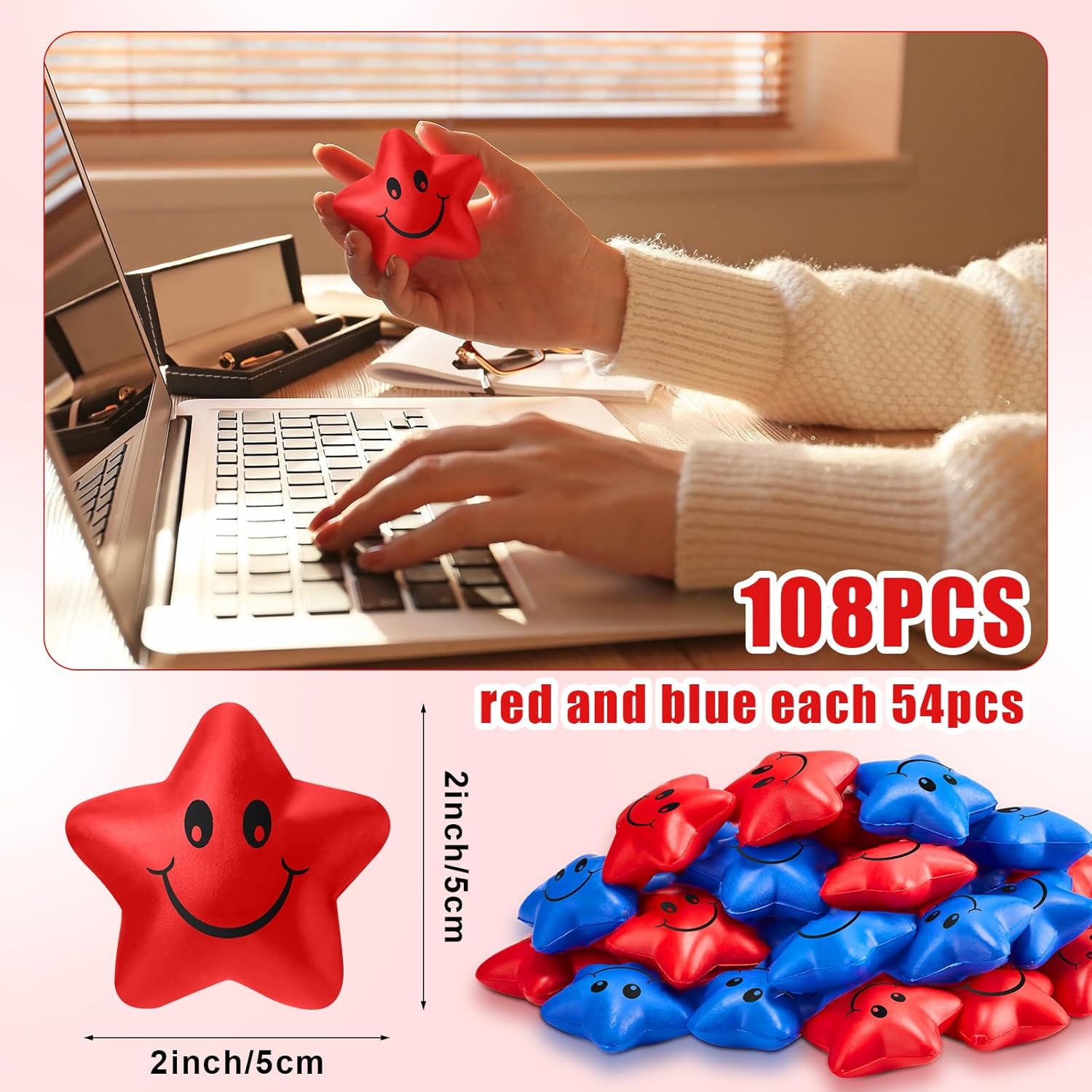 Features: The foam stars are small and lightweight, which allow you to easily carry and play with at any time and anywhere. The star shaped stress relief toys are also suitable as class rewards, party favors, game prizes, carnival prizes, gift bag fillers, and more. Specifications: Material: foam Color: blue, red, black Size: 2 inch/ 5 cm Package includes: 108 x Star stress balls Notes: Manual measurement, please allow slight errors on size. The color may exist a slight difference due to different screen displays. Suitable for people over 6 years old.
