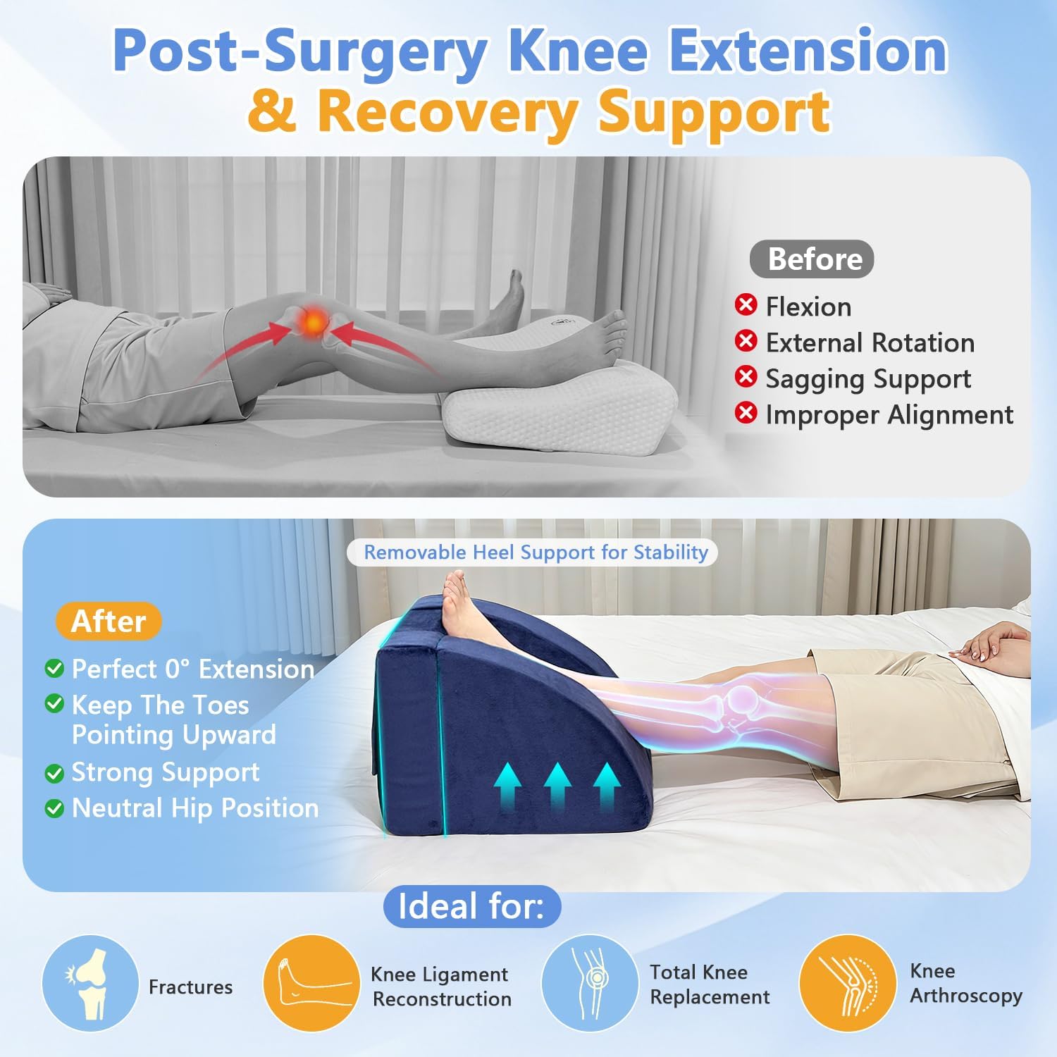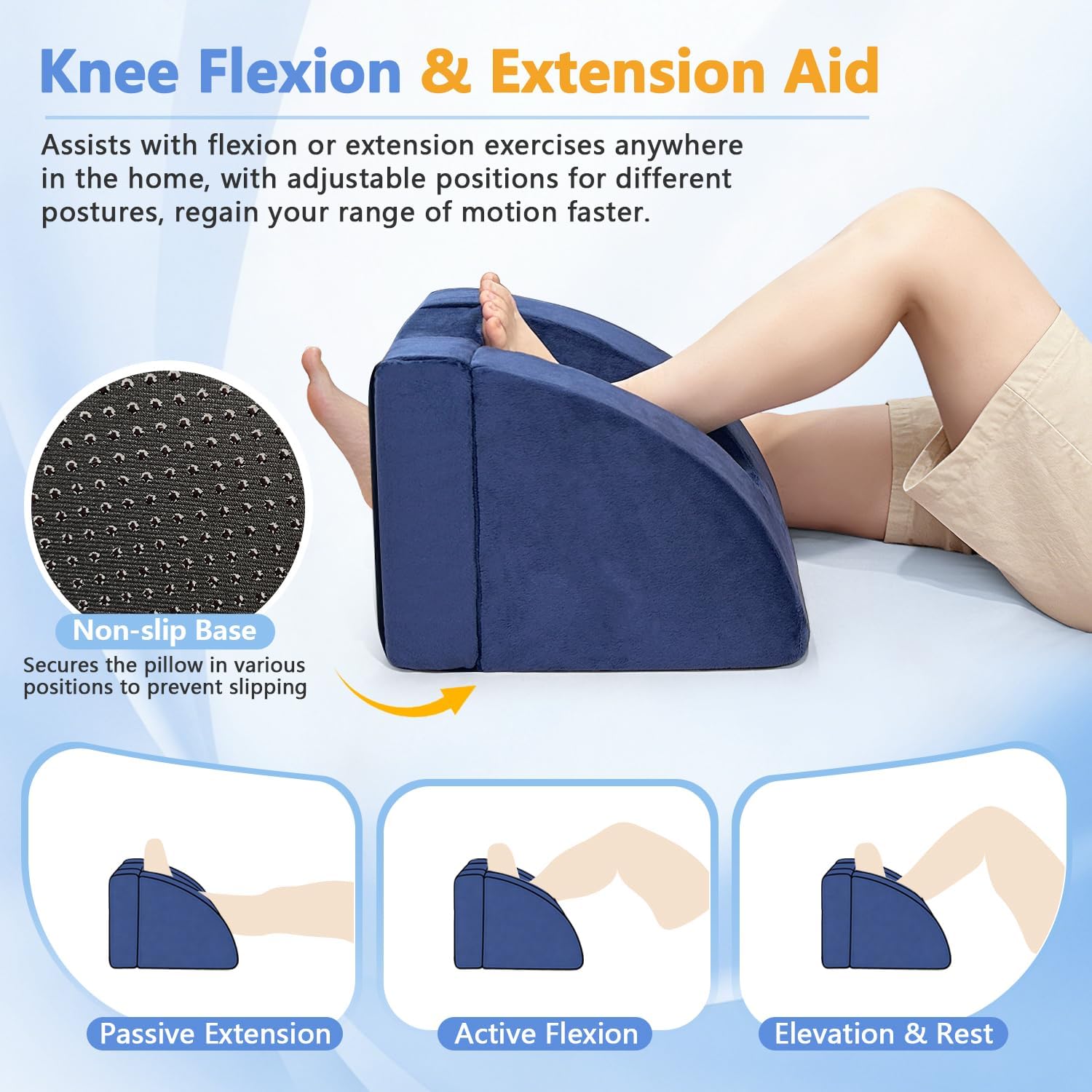 Knee Replacement Pillow Recovery Aids, 2-in-1 Knee Surgery Pillow Recovery Equipment, Post Surgery Knee Replacement Elevation Wedge, Knee Extension Pillows Foot Support for Acl, Mcl, Hip Surgery Our knee replacement pillow is engineered to promote full knee extension by providing a stable, 4.33-inch elevation. It slightly elevating the knee joint while creating ample, comfortable space beneath the calf. Reducing swelling, minimizing strain on the surgical site, and facilitating optimal alignment during the critical healing phase. Ideal for both passive extension and active recovery exercises like heel slides. Dual-Function 2-in-1 Design Unlike standard recovery pillows, our innovative design features a removable heel baffle. Use it as a specialized knee surgery pillow to lock in leg alignment, or detach the baffle to transform it into a professional heel protector cushion. This suspended-heel mode is specifically designed to float the heel in the air, effectively relieving pressure spots and helping to reduce the risk of pressure sores and foot drop during long periods of rest. Features Optimal Elevation: Provides 4.33-inch elevation to effectively reduce leg edema and pressure, support healthy blood circulation. Anti-Rotation Support: Foam pads on both sides keep toes pointing upward, preventing harmful hip external rotation and ensuring the knee, ankle, and hip stay in perfect alignment. Zero-Pressure Heel Recess: The open-channel heel recess suspends the heel, eliminating pressure points to protect against bedsores and providing more breathable experience. Applicable to After Knee Replacement & Hip Surgery Recovery ACL, MCL, and Meniscus Reconstruction Rehab Leg Fractures and Lower Limb Trauma Support Premium Materials High-density foam that retains its shape and supportive properties over time. Soft short plush cover, keep skin warm and comfortable. Zipper design allows for removable cover, machine washable for easy cleaning. Specifications Color: Dark blue Dimensions: 13.58“ × 10.43” × 10" Material: High-density foam+short plush cover Package Includes: 2-in-1 Knee replacement pillow ×1