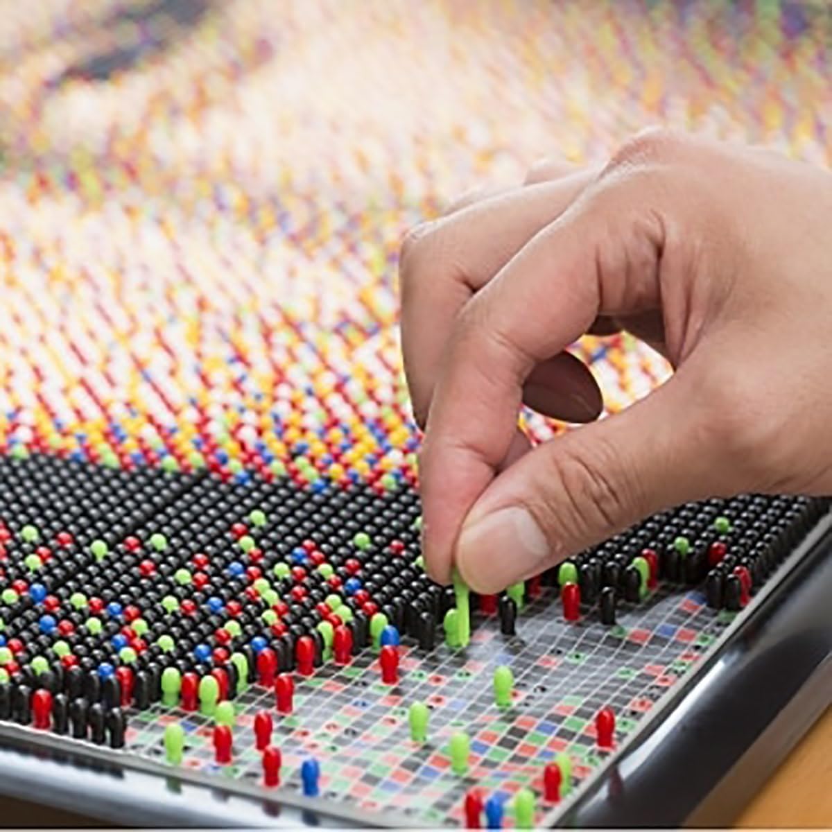 Create your own masterpiece with the Mona Lisa Pixel Art Set. Just place the pattern card over the pegboard and stick the corresponding color through. Color coated pattern cards makes is easy to follow along. The pegs come in six colors. Yet when the pixel art is complete, a broad spectrum of colors appear. The set includes 9 pegboards, frame, 9 color coated pattern cards, and 10,800 pegs in 6 colors.