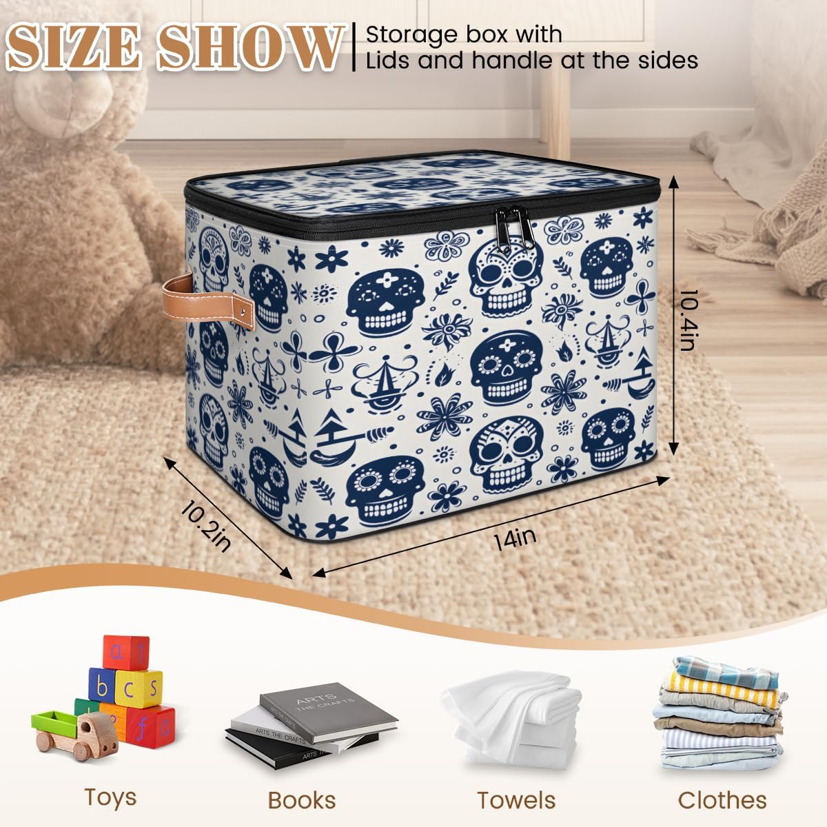 Storage Bins Size: 15(L)x 11(W)x 9.5(H)inches. Large capacity storage basket, can hold a lot of things, save space, also can prevent things messy, keep the home and room clean and orderly. Multi-function: Foldable storage box can be used as closet organizers, toy storage, shelf basket, blanket basket, storage box, laundry basket, wardrobe basket, clothes storage bins, bathroom baskets, under bed storage containers and so on. Can store toys, blankets, books, clothes, quilts, socks, shoes, all kinds of items, can be put anywhere you want. Various Occasions: Storage boxes are suitable for closet, shelf, bedroom, closet, kid's room, bathroom, nursery, laundry room, living room, dormitory, apartment, office, locker room, pantry, balcony, living room, kitchen, game room and other occasions. Practical Gifts: The clothes organizer is a thoughtful choice for birthday parties or Christmas, Mother's Day, Father's Day, Valentine's Day, Easter, etc., for mom, dad, him or her, friends or colleagues.