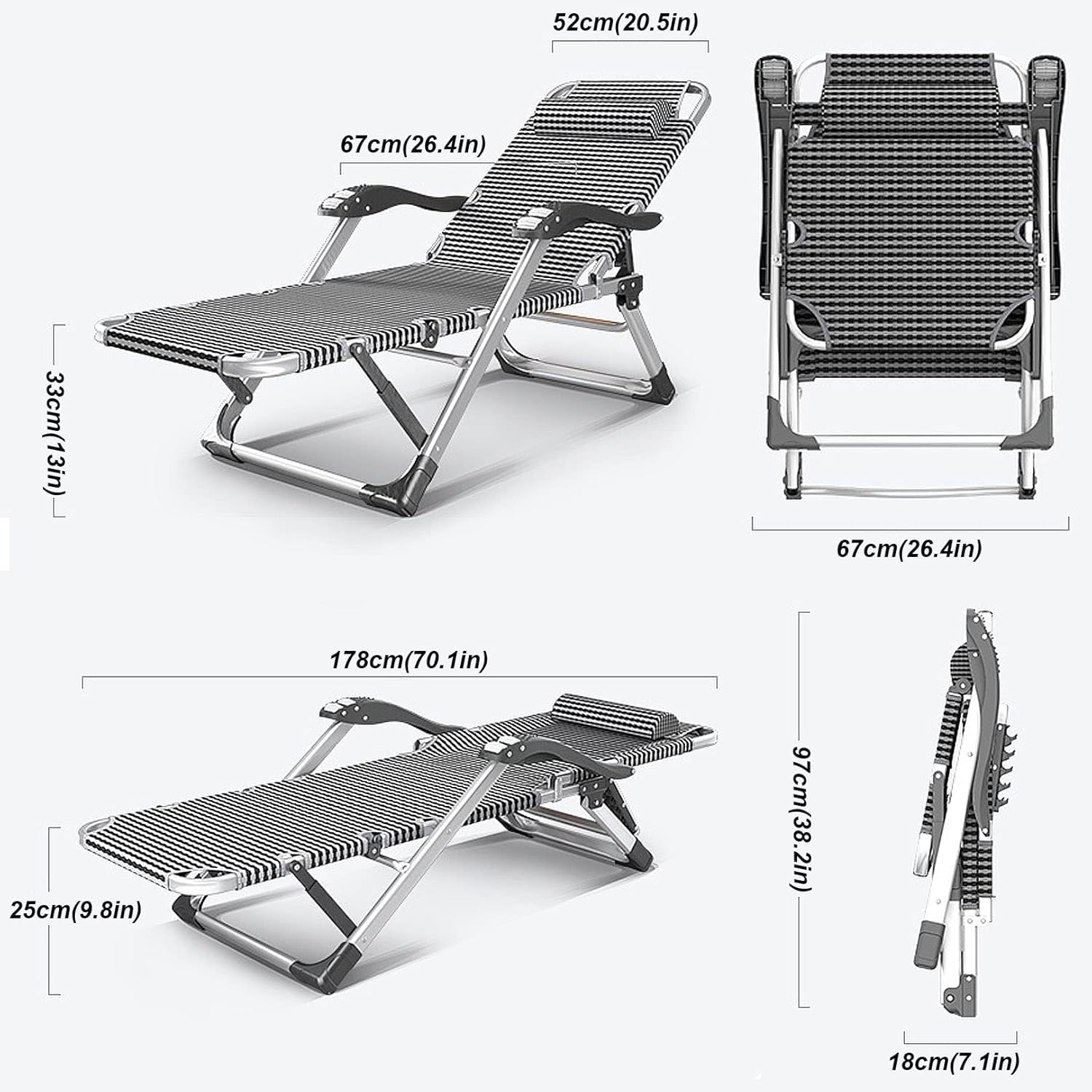 Decorate your home and outdoor environment Whether it\u2018s soaking up the sun on the beach, having a picnic in the wild, playing games with the kids in the garden, having afternoon tea by the pool, chatting on the balcony, or having a party in the yard. There is no doubt that this recliner will make your outdoor leisure activities enjoyable and unforgettable. 【Features】 - For your extra comfort and neck support. - The modern and pleasant design is perfect for relaxing in your garden or by the pool and beach. - Lightweight and foldable design for easy storage and perfect transportation. - Beach loungers provide more support for your back. - Made of high quality metal and fabric material, wear-resistant, durable and easy to clean. 【Specifications】 - Package Included: 1 X Recliner 1 X Cotton Pad 【Warning】 1. Due to manual measurement, please allow an error of 1-3cm, and make sure you don\u2018t mind before ordering. 2. Please understand that due to the different positions of the pictures, the colors may have chromatic aberrations. 3. If you have any problem or your product is damaged during the using, please contact us anytime, we will respond to you within 24 hours to ensure that each of our customers is able to get a satisfying shopping experience.