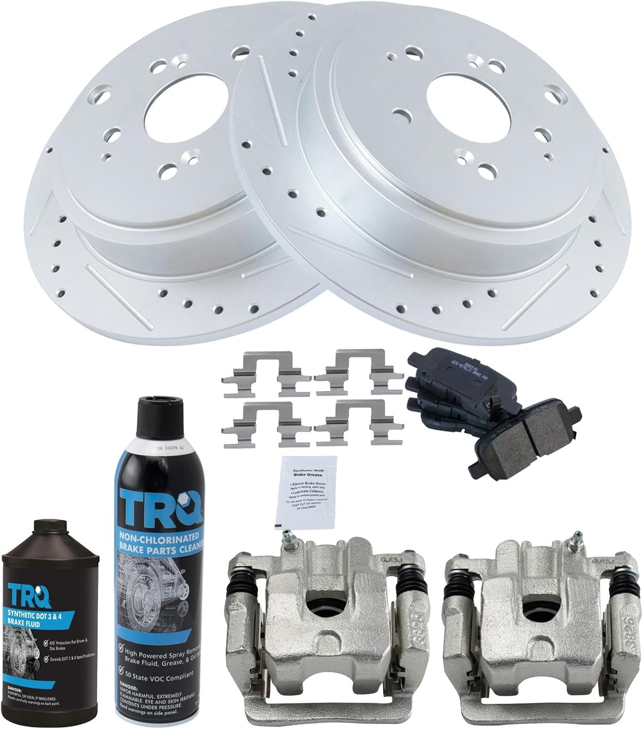 Dot 3 & 4 Semi-Metallic Performance Brake Pad & Rotor KitKit Includes(1) Brake Cleaner & Fluid Kit(1) Rear Premium G-Coated Performance Brake Rotor Set(1) Rear Semi-Metallic Brake Pad Set(2) Rear Brake CalipersFitmentAcura MDX 2001 - Rear 2002 - Rear with Rear Disc Brakes 2003-05 - Rear 2006 - Rear with Rear Disc BrakesHonda Pilot 2003-08 - Rear with Rear Disc BrakesProduct AttributesGrade Type: PerformanceFriction Material Composition: Semi-metallicSurface Type: Slotted X DrilledChemical Specifications: Dot 3 & 4Product Line: PerformanceBrake Rotor Coating: Premium G-CoatedBrake Pad Bonding Type: Premium PosiBrake Pad Friction Material: Semi-MetallicProduct Features Positive Molded: Less dust resulting in clean wheels Electrostatic Coated: Long-lasting rust protection G3000 Casting Alloy: Reduced noise and improved wear resistance Application Specific Design: Extended service life, no modificationsItem DetailsTRQ brake kits are designed to restore your brake system to like-new performance. TRQ brake pads are positive molded, thermal scorched, chamfered, and utilize a multi-layer shim for enhanced performance and service life. TRQ G-coated rotors have long-lasting rust prevention, perfect for wheels with large openings that expose the rotor and rotor hat during daily drives. All products are fit and road-tested in our Massachusetts R&D facility to ensure we deliver on our promise of Trusted Reliable Quality.Reference Numbers10-C516610-C516714-516614-5167141.40513141.4051418FR2067C18FR2068C19-B267419-B267519B267419B267522-01015L22-01015R31318331-5960843022S0XA0043022S3VA0143022S3VA0243022S3VA1043022S3VA1198003299-01015L-C99-01015R-CBD126051BR31318C40513C40514EHT865HFRC11285FRC11285NFRC11286FRC11286NPRT5393